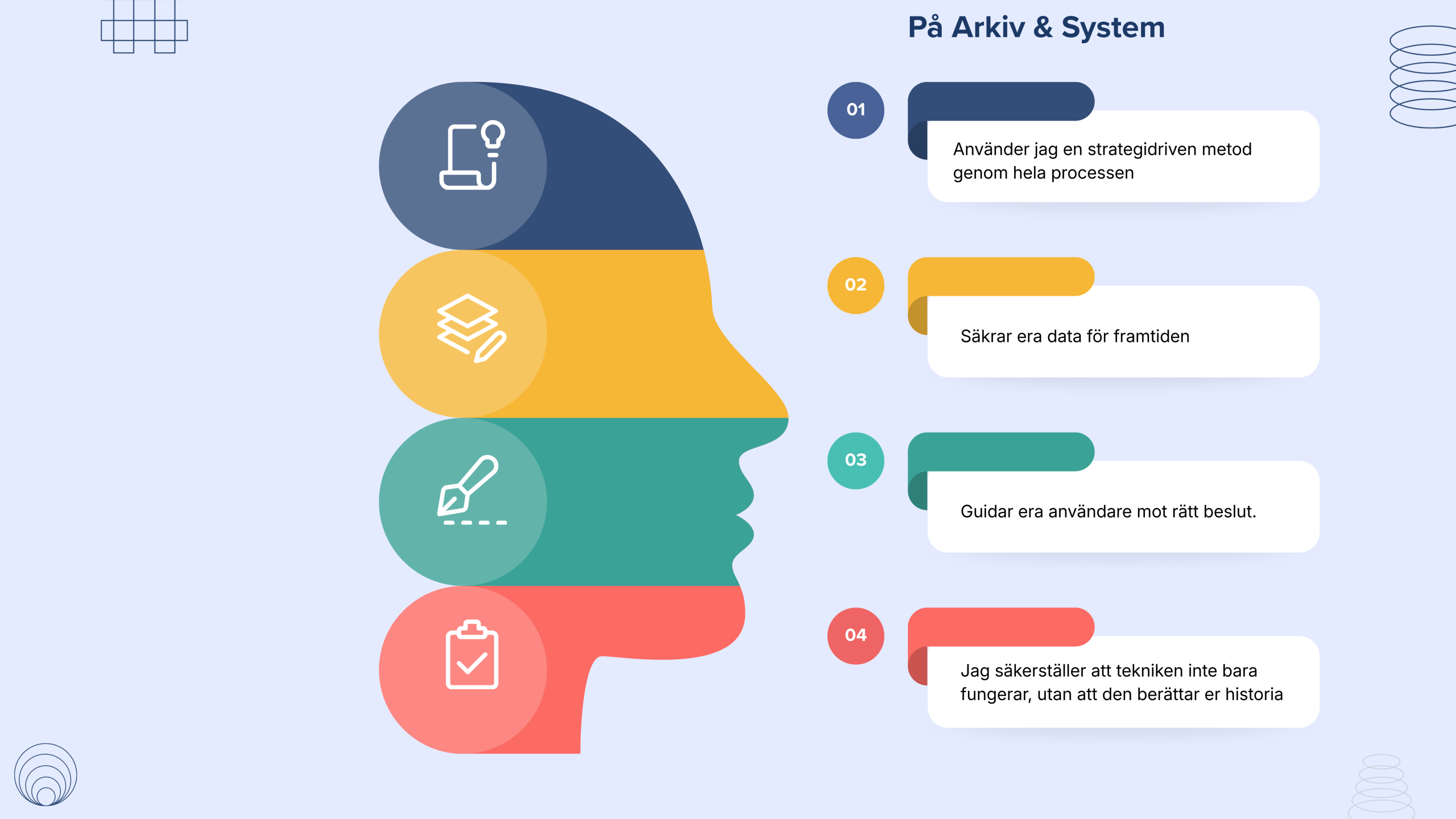 Strategisk rådgivning och implementering av rättssäkra lösningar för långtidsarkivering.