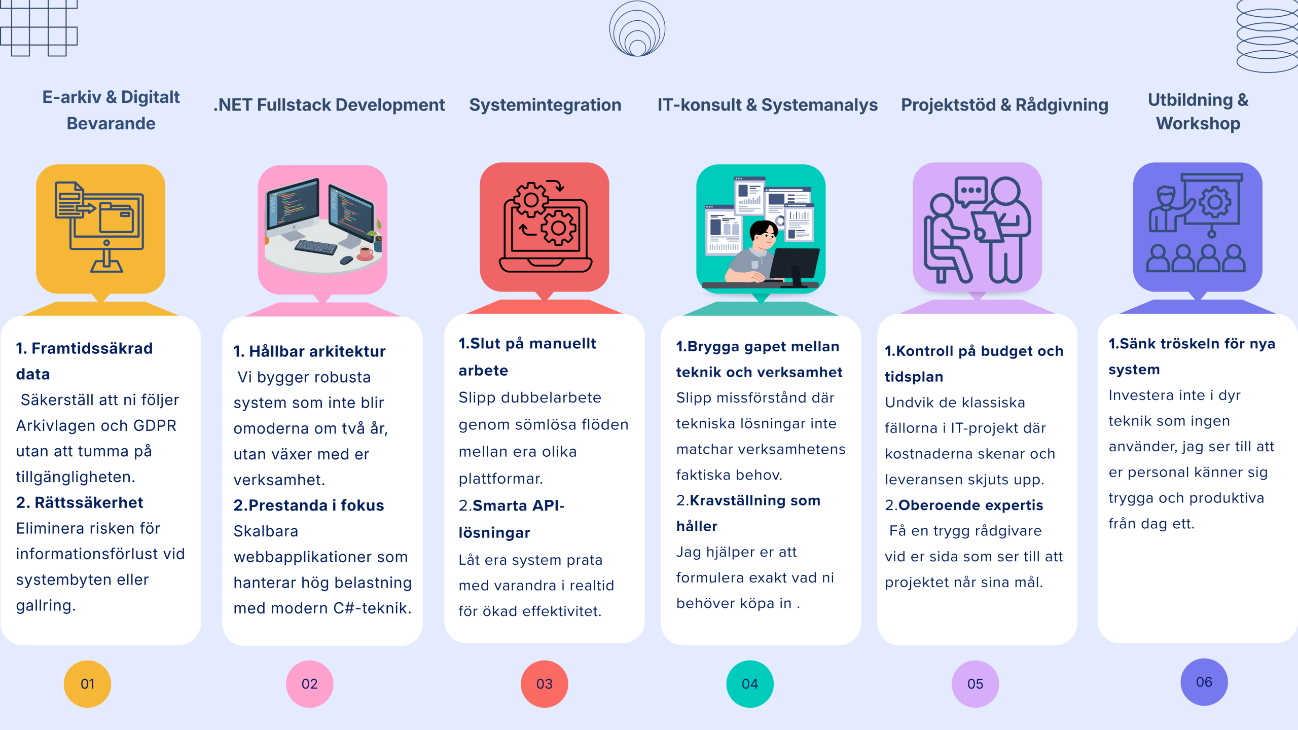 Det innebär att vi aldrig börjar koda förrän vi vet varför. Jag analyserar affärsmålen först, så att den tekniska lösningen faktiskt stödjer er verksamhet och inte bara blir ett verktyg i mängden.